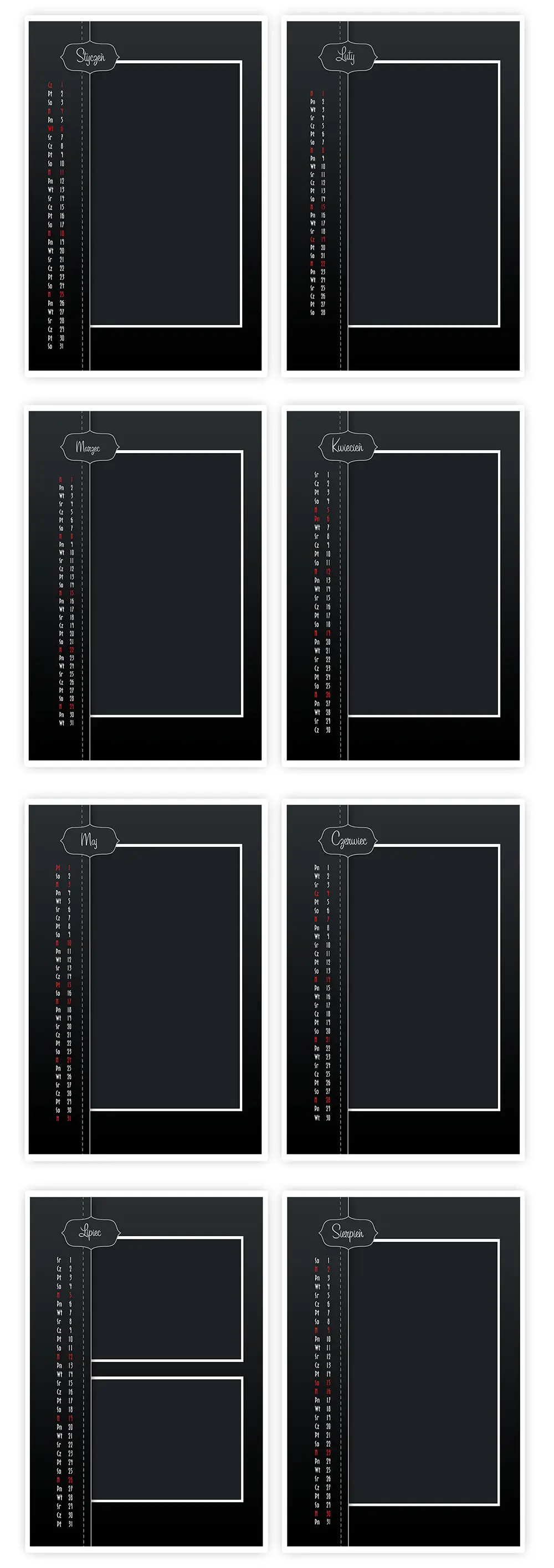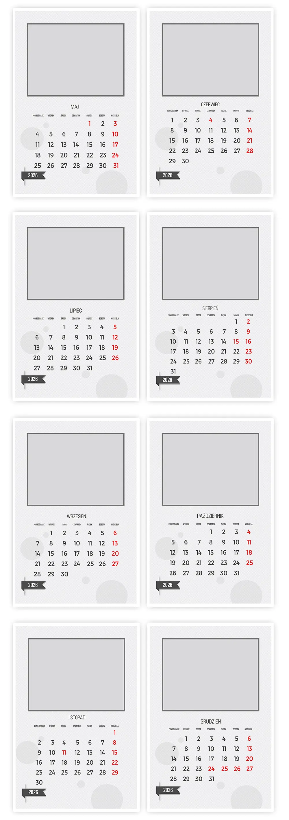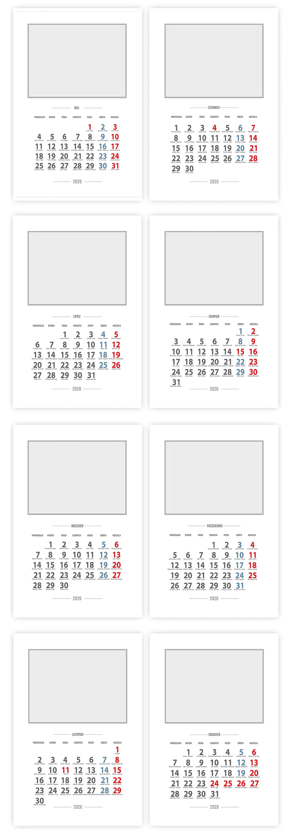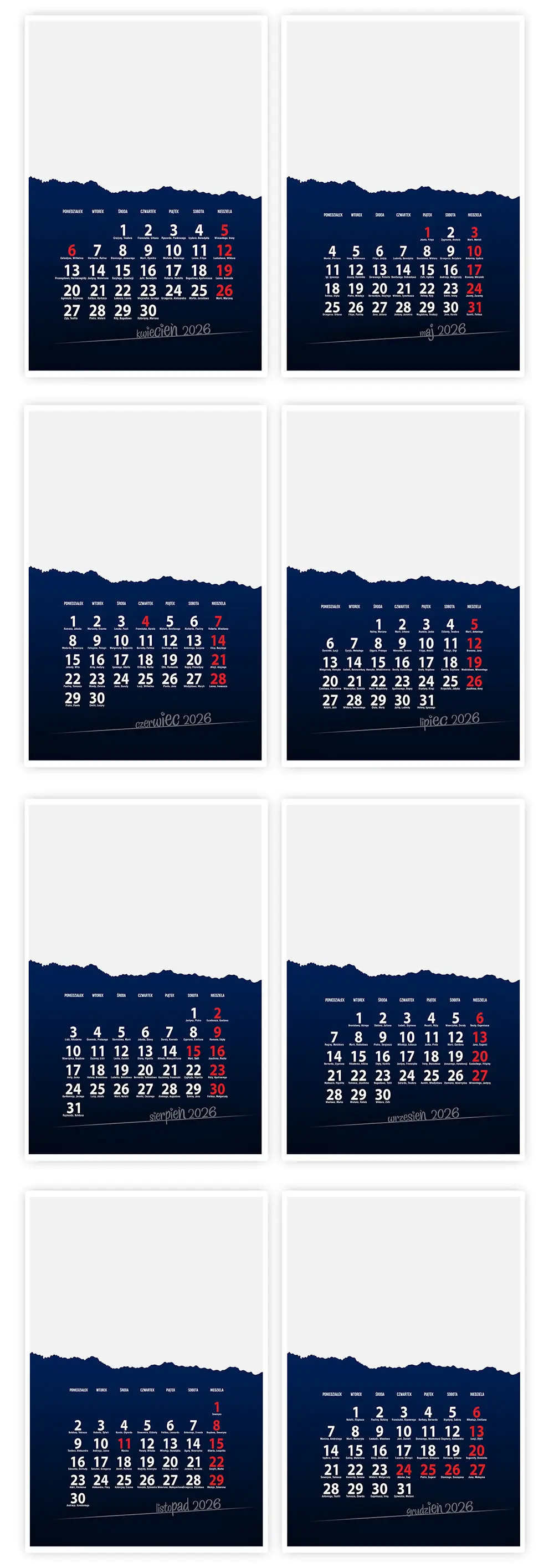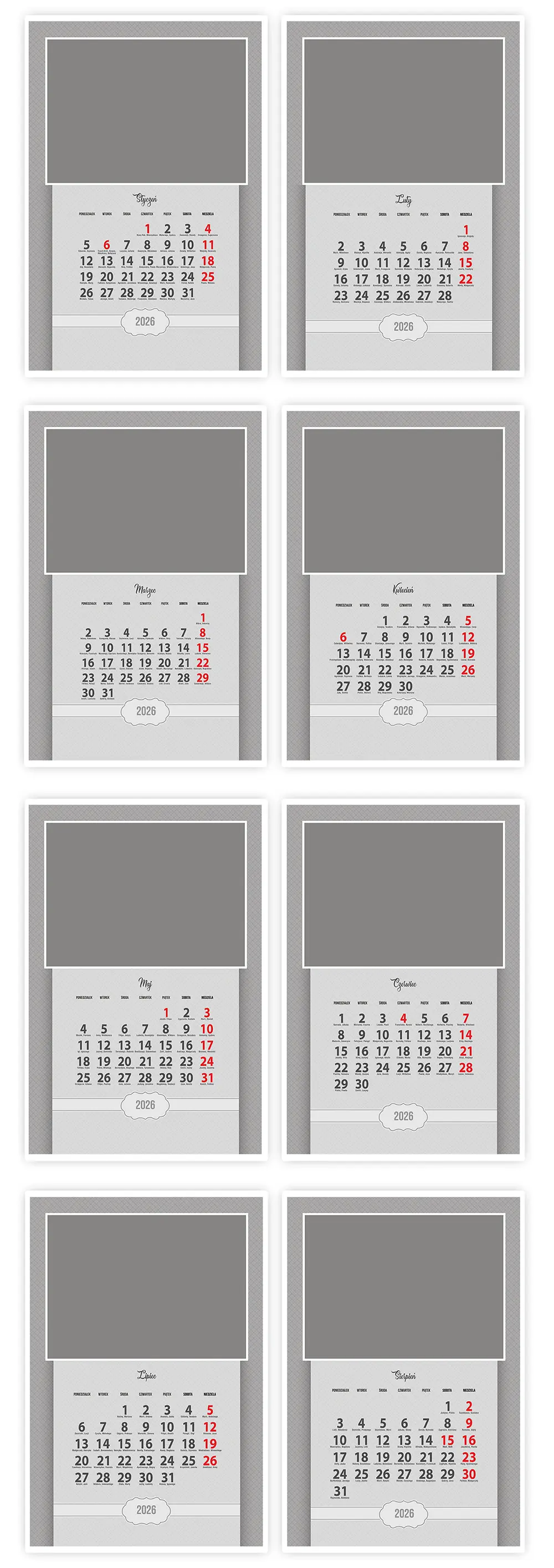 - Liczba stron: 12 oddzielnych plików PSD (styczeń 2026 – grudzień 2026)