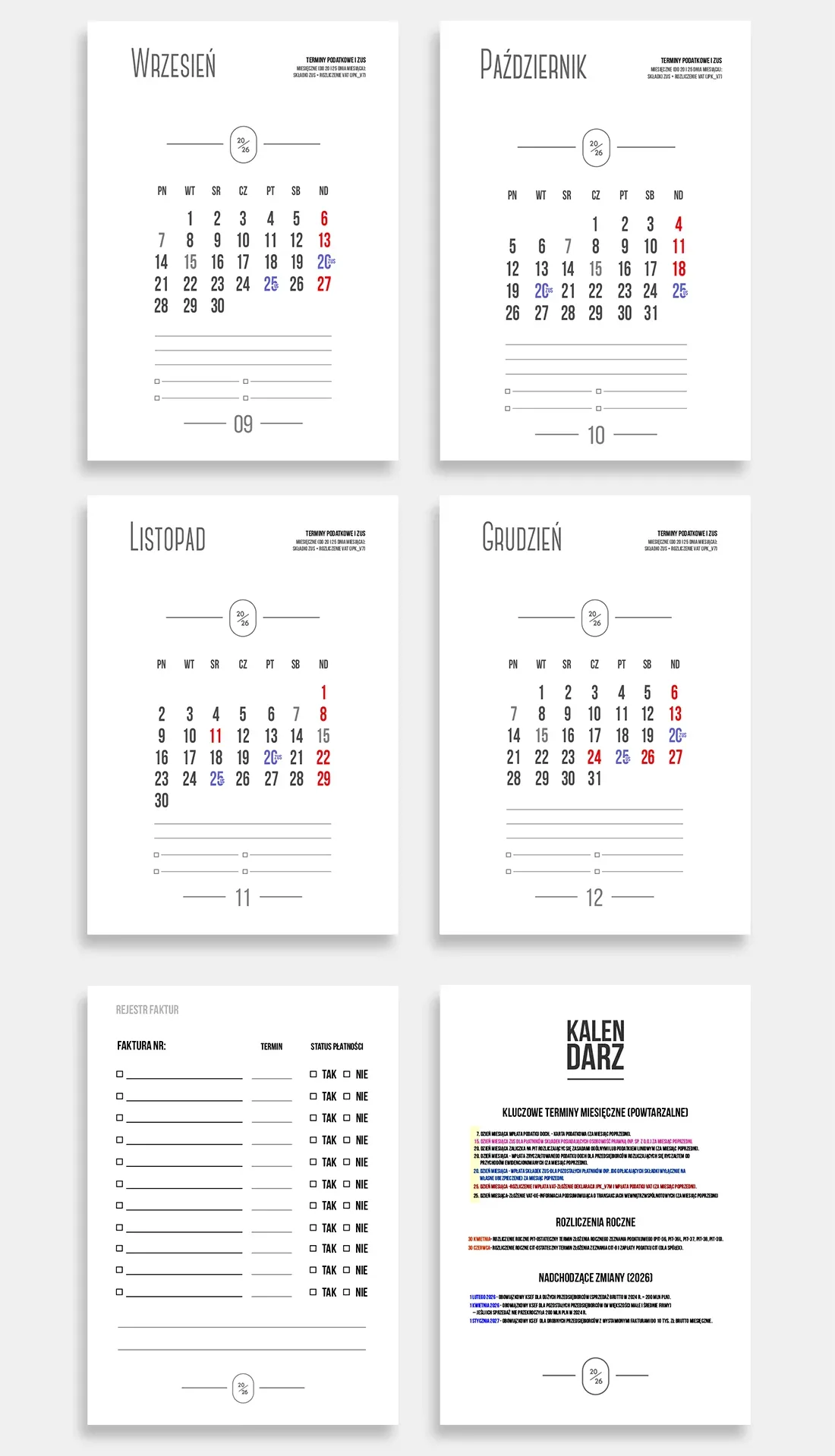 Każdy miesiąc roku 2026 zaprojektowany z myślą o specyfice prowadzenia firmy w Polsce. Terminy płatności VAT. Kwartalne zeznania. Sezony sprzedażowe. Planowanie budżetu. Monitoring cash flow. Koordynacja zespołu. To wszystko wymaga wizualnego systemu, który nie zawiedzie w krytycznym momencie.