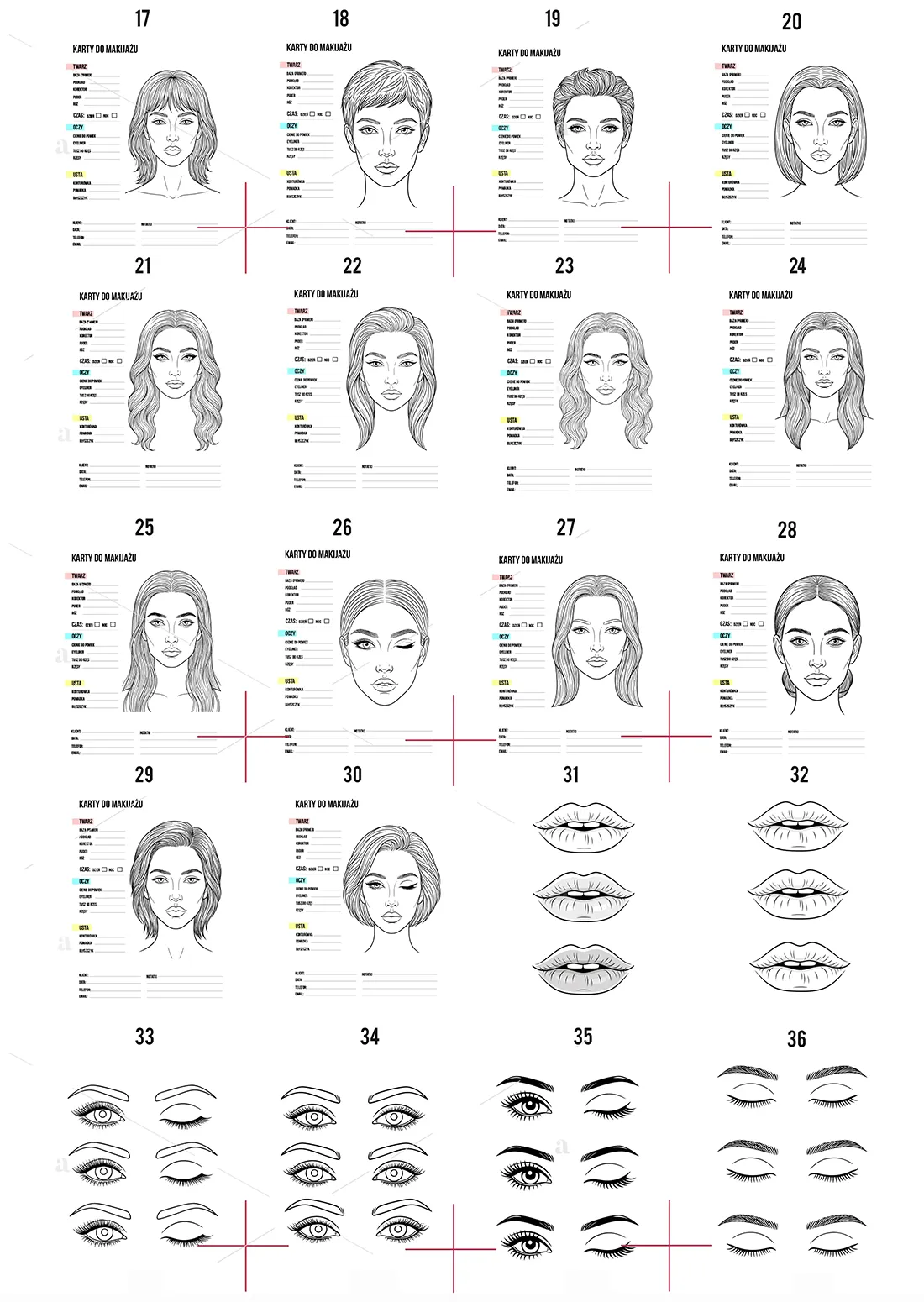 - Makeup Face Chart version – gotowe karty do projektowania pełnych makijaży, testowania stylów i tworzenia wizualizacji dla klientek.