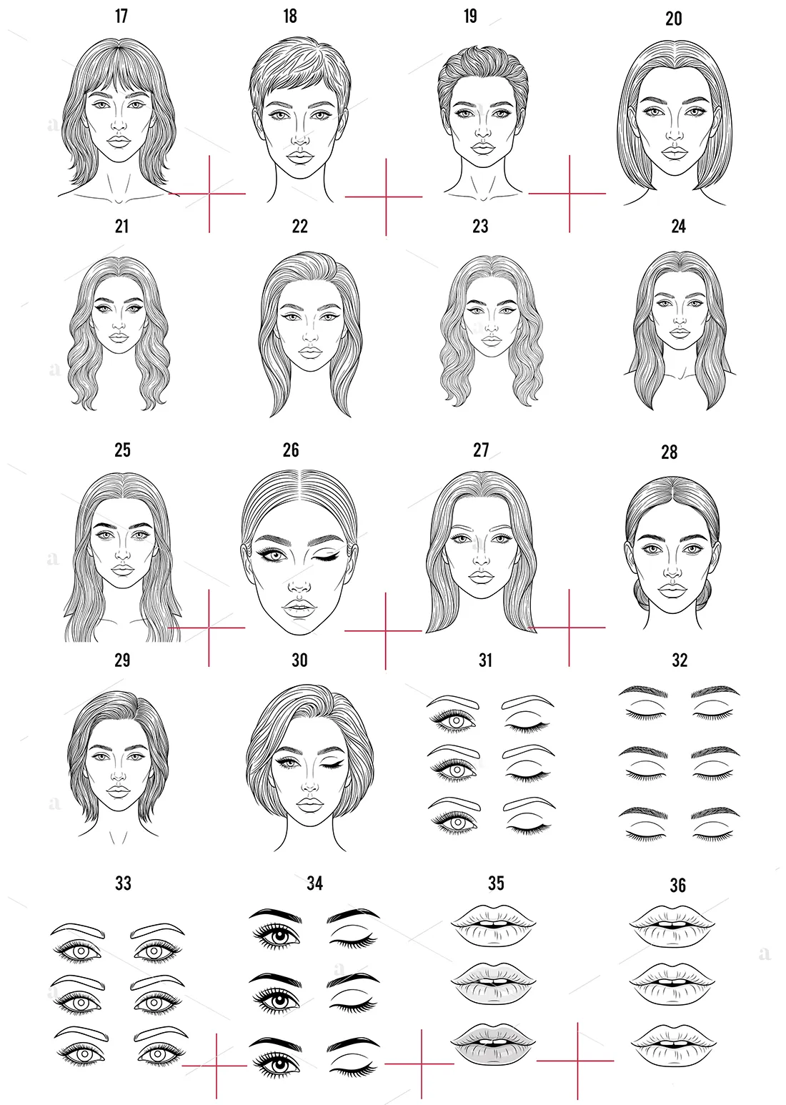 Ta wersja zawiera projekty z uwzględnieniem różnych fryzur oraz kształtów twarzy. Dzięki temu możesz projektować makijaż w kontekście całościowej stylizacji.