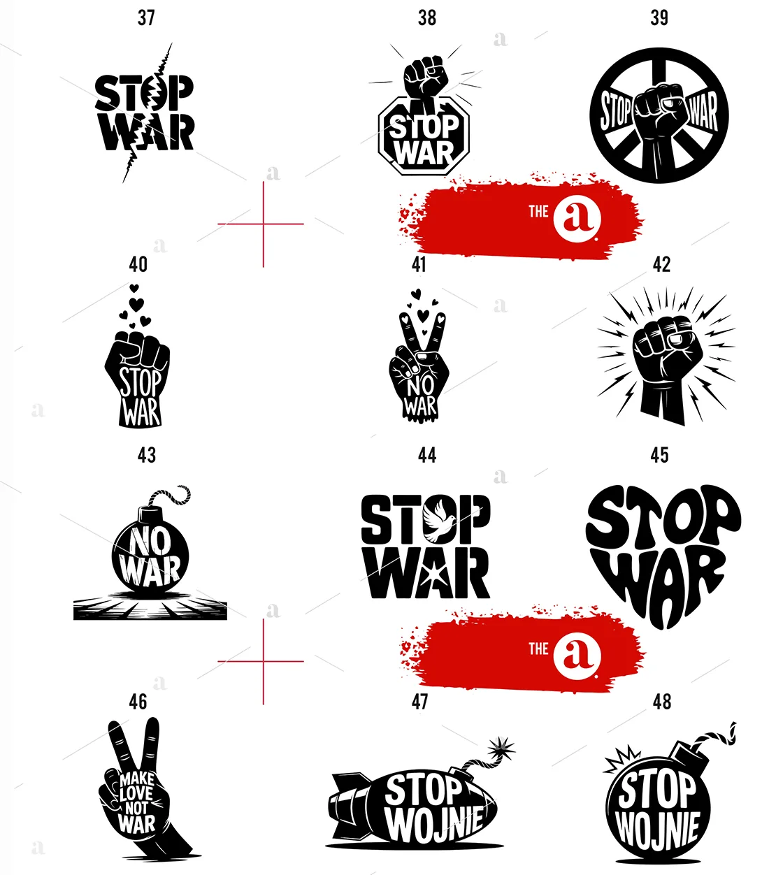 W pakiecie znajdziesz projekty wykorzystujące zarówno bezpośrednie, mocne hasła „NO WAR”, „STOP WAR”, „PEACE”, jak i subtelne, symboliczne przedstawienia. Od znaku pokoju (peace symbol), gołębicy z gałązką oliwną, po połamane karabiny, uściski dłoni przedstawicieli różnych narodów czy glob ziemski opleciony łańcuchem jedności. Ta różnorodność pozwala trafić do różnych odbiorców i dostosować przekaz do kontekstu.
