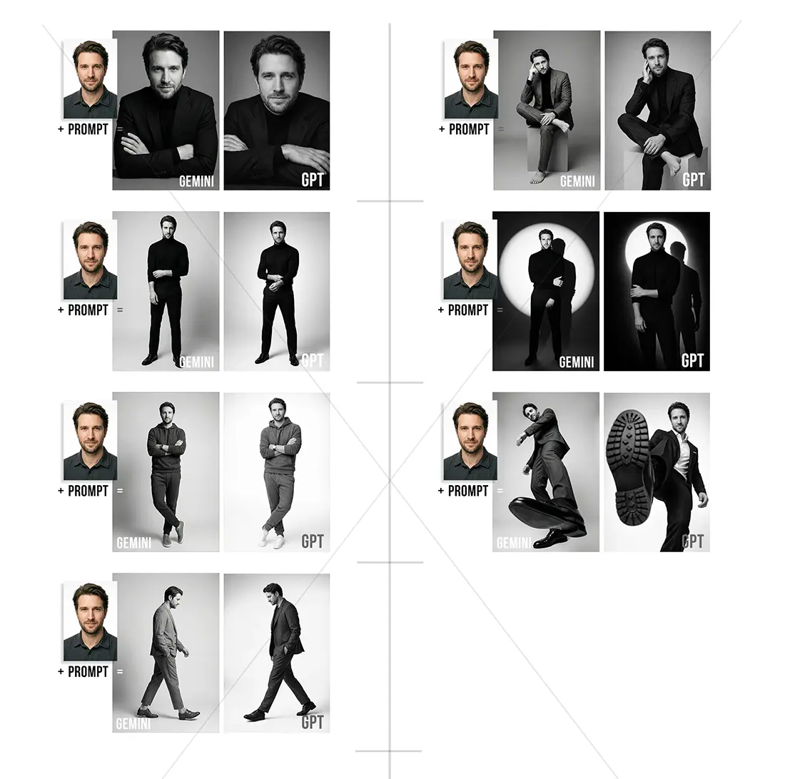 Dzięki temu AI generuje nowe, profesjonalne zdjęcia studyjne, zachowując cechy twarzy, ale nadając im zupełnie nowy, artystyczny charakter.